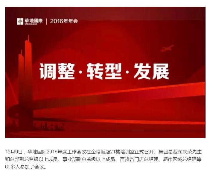 2015年12月16日,華地國際百貨事業(yè)部2016年度工作會議在金陵飯店21樓培訓室召開。集團總裁陶慶榮先生,集團副總裁、百貨事業(yè)部總經理徐志強先生及事業(yè)部各部門高級經理以上人員、門店總助級以上人員參加了會議,各門店經理級人員通過視頻會議以分會場形式列席了會議。徐志強發(fā)表講話徐總圍繞“轉型與效率”兩方...